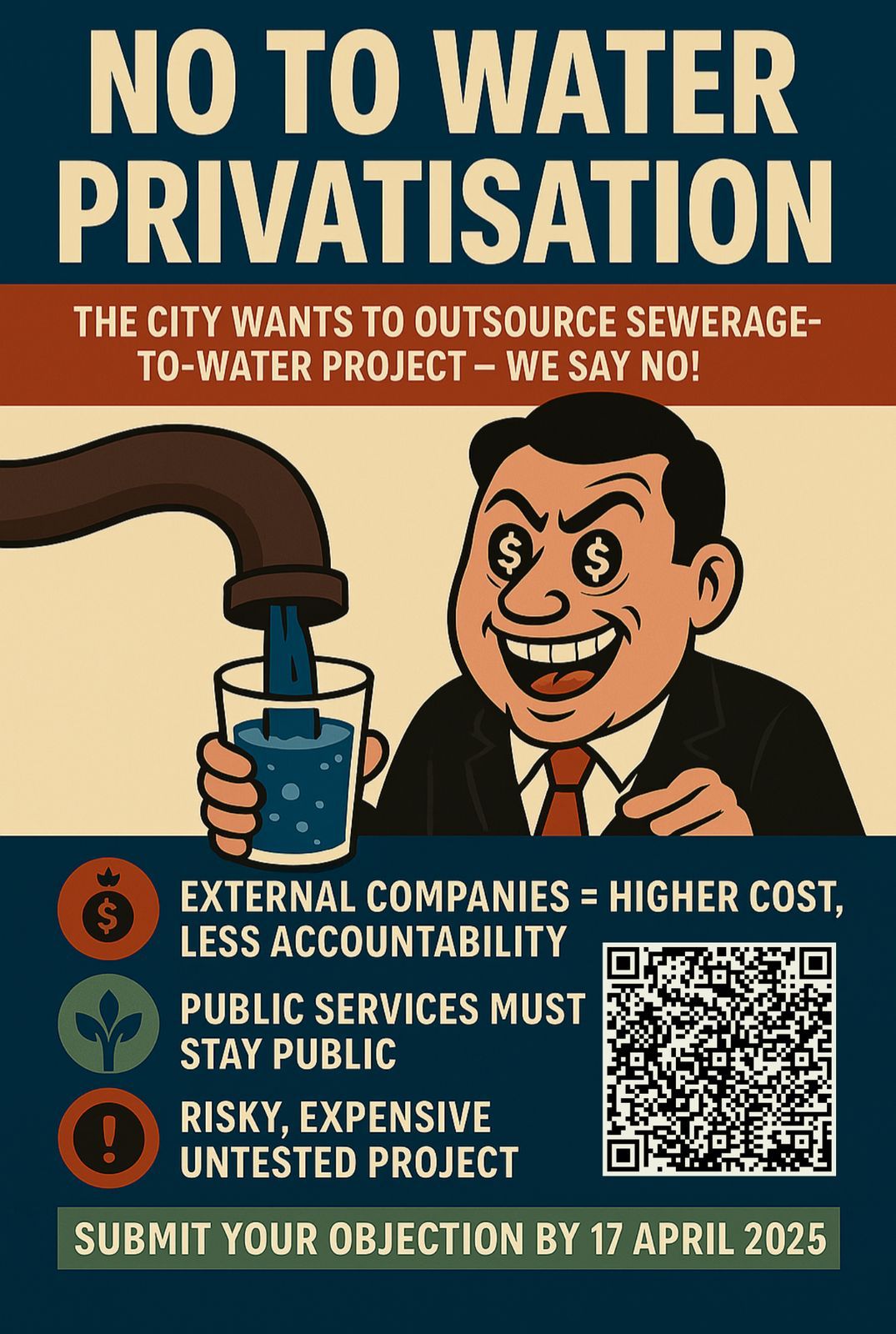 We urge everyone—individuals, organisations, communities—to make their voices heard by the 17 April deadline. Say no to water privatisation. This can be done in person at any sub council office, by email, or through the following online form: